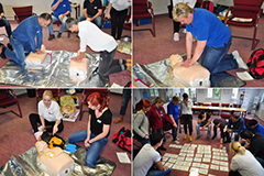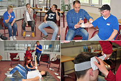 Selbst nahm sie ebenfalls am Kurs teil. Die Johanniter-Ausbilderin Katharina Merk machte die Mitarbeiter in 9 Unterrichtsstunden anhand verschiedener Lerninseln mit verschiedenen Vorgehensweisen am Unfallgeschehen vertraut. Trotz ernster Themen stand dabei definitiv das aktive Mitmachen und der Spaß am Helfen im Mittelpunkt. Alle Teilnehmer übten gemeinsam die stabile Seitenlage, die Wiederbelebung u.a. unter Zuhilfenahme eines Defibrillators, das Anlegen verschiedener (Druck-)Verbände und das Abnehmen eines Helms eines bewusstlosen Motorradfahrers. In verschiedenen vorgegebenen gespielten Situationen wurde jeweils ein Opfer/Patient von zwei Ersthelfern entsprechend seines Notfalls umsorgt. Um die Mittagszeit gab es zur Stärkung ein gemeinsames Mittagessen.