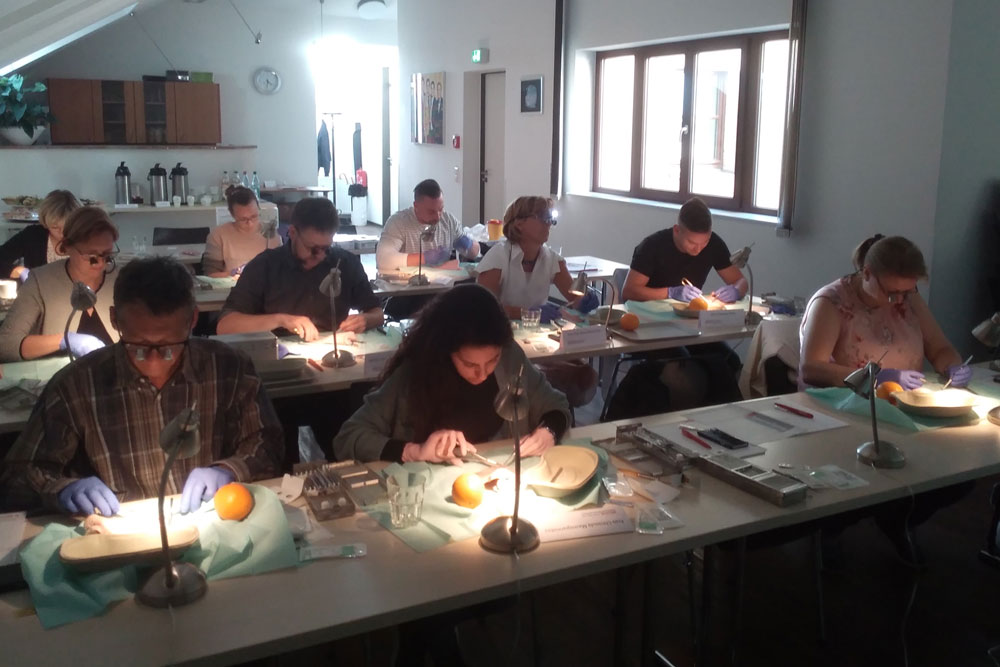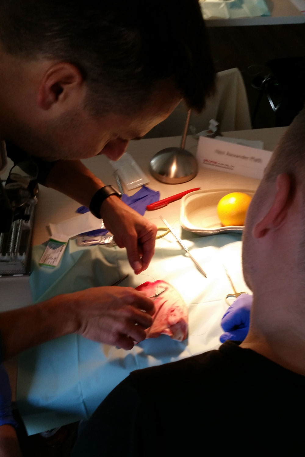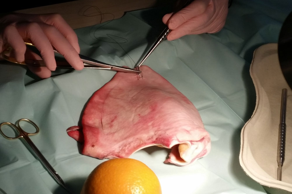 An Schweineohren und Orangen trainieren Zahnärzte Schnittführung, Nahttechniken und Wundversorgung