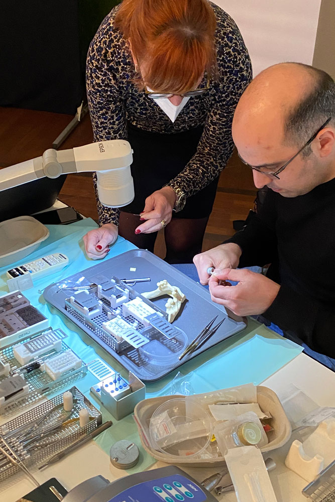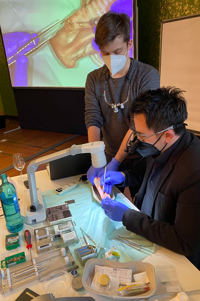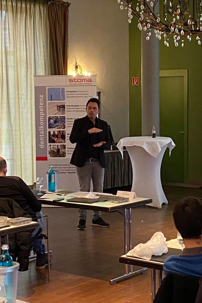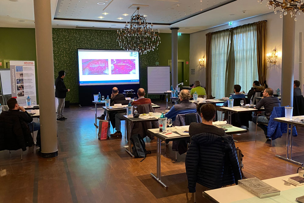 Hart- und Weichgewebsmanagement waren die zentralen Themen dieses praxisorientierten Stoma-Workshops mit Referent Dr. Robert Würdinger. Behandlungsmethoden wurden kritisch hinterfragt und die Grundlagen sowie Vor- und Nachteile der verschiedenen Augmentationstechniken aufgezeigt. Außerdem stellte der Referent autologe und allogene Knochentransplantate einander gegenüber. Die Teilnehmer durften während des praktischen Teils am Schweinekiefer und am Kiefermodell üben, u.a. die Knochenschalentechnik mit stoma micro-screws. Die Teilnehmer lobten anschließend vor allem die praxisnahe Präsentation sowie die fachliche und sachliche Kompetenz des Referenten. Im bewusst klein gehaltenen Teilnehmerkreis konnte außerdem ein guter kollegialer Austausch stattfinden.