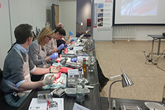 Die vermittelten Techniken wurden von den Teilnehmern im groß angelegten Praxisteil mit großem Eifer und unter Aufsicht des Spezialisten trainiert. Die Teilnehmer versuchten sich unter anderem in der Technik des koronalen Verschiebelappens mit und ohne vertikale Entlastungsinzision und übten die Entnahme von Bindegewebstransplantaten. Geeignete Nahttechniken für eine optimale Schließung der Donorstelle am Gaumen wurden mit passendem Stoma-Nahtmaterial getestet. Wir unterstützten die Teilnehmer mit passendem Instrumentarium und Tierpräparaten, die Firma Geistlich stellte entsprechende Biomaterialien zur Verfügung.